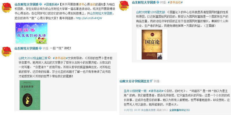 自10月份启动以来,学校各级团组织积极发动学生参与,各团总支与团支部通过微博以图片文字等各种形式展示全校学生开展读书活动的情况,积极刊登我校学生读书体会,发布信息引导学生阅读理论书籍和经典名著。金融学院、会计学院团总支与团支部积极踊跃,会计1205班级团支部和金融1203班级团支部的微博内容被团委微博多次转载。管理科学与工程学院的信管1201团支部等学院团支部多次发布读书信息,积极参与活动开展。