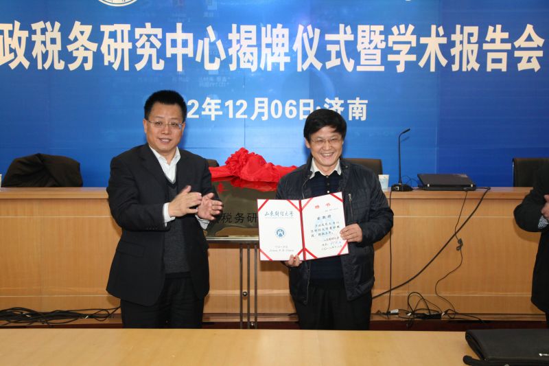 12月6号,山东财经大学财政税务研究中心揭牌仪式及学术报告会在舜耕校区举行。副校长崔友平,武汉大学经济与管理学院财政税务系主任、博士生导师卢洪友、学校社科处、科技处、人才工作办公室负责人出席会议。崔友平为研究中心揭牌并为卢洪友颁发了兼职教授聘书。会议由财税学院院长岳军主持,财政税务学院教师、研究生和三、四年级的本科生参加会议。