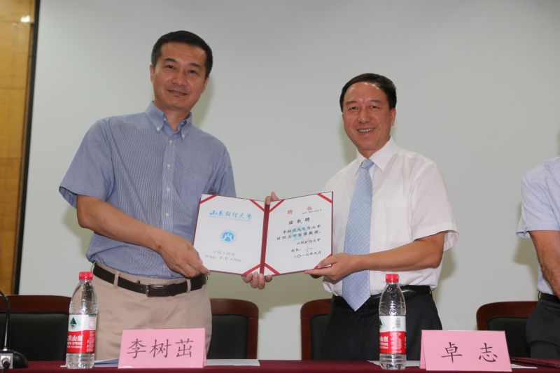 授聘仪式上,张红凤院长首先介绍了出席仪式的领导和嘉宾,并详细介绍了Feldman教授和李树茁教授的学术业绩;随后介绍了山东省的经济文化优势、山东财经大学以及公共管理学科的发展历程和建设成绩。卓志校长向两位客座教授颁发了聘任证书并表达了欢迎之情。李树茁教授代表Feldman教授和自己做了受聘感言。