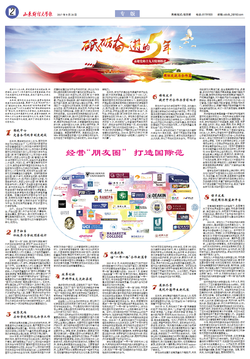 五年来,围绕学校的中心工作,国际交流与合作处相继出台了《山东财经大学国际合作项目管理规定》《山东财经大学院际国际交流与合作项目实施办法》《山东财经大学课程国际化项目实施办法》《山东财经大学本科生出国(境)学习管理规定》《山东财经大学教学科研人员因公临时出国(境)管理办法》等20余项国际化工作文件。这些文件紧紧围绕人才培养、师资队伍、学科建设等学校的中心工作,鼓励各学院开展国际交流与合作,已被学院作为国际化办学的行动指南。比如在国际化人才培养方面,规范本科生出国(境)学习交流等事宜的办理程序,支持和鼓励学生赴国(境)外学习,拓宽学生视野,培养具有国际视野的人才;在师资队伍国际化方面,加强教学科研人员因公临时出国(境)管理,鼓励教学科研人员更广泛地参与国际教育教学、学术交流与合作;在课程国际化方面,鼓励邀请境外专家参与我校国际化课程建设,促进我校自身课程体系的建设和课程质量的提高;在建立教学科研国际合作平台方面,支持我校与境外高层次大学之间建立长效合作机制,构建“以院部为主体”的国际合作平台,形成校院两级管理、开放式国际化办学新格局。