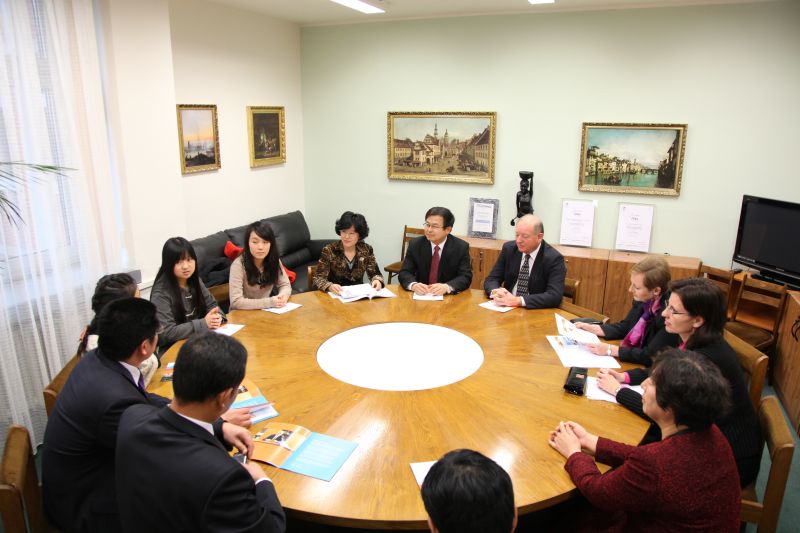 布拉格都市大学是捷克以国际关系研究为重点的私立大学。该校公共管理与人文学院的亚洲问题研究中心,开设汉语教学课程。该校校长Michal Klima教授、国际关系及欧洲问题系主任Mictchell A. Belfer博士、亚洲问题研究和国际关系专家Tomas Petru博士、国际部主任Josef Vochozka及曾在我校任教的国际贸易研究学者Vilem Semeral博士热情地接待了我校代表团一行。校长Michal Klima教授介绍了学校的现状和对中国的研究情况,希望与我校建立友好关系并开展实质性合作,表达了双方共同建立孔子学院的愿望。