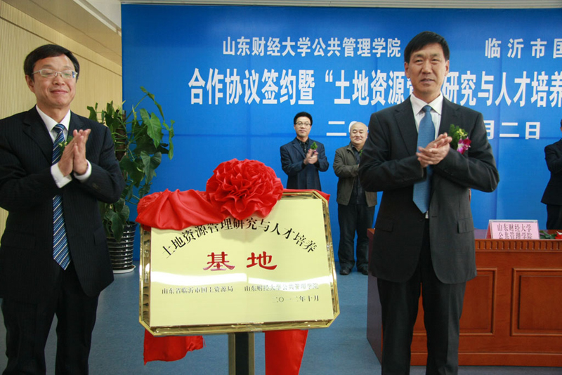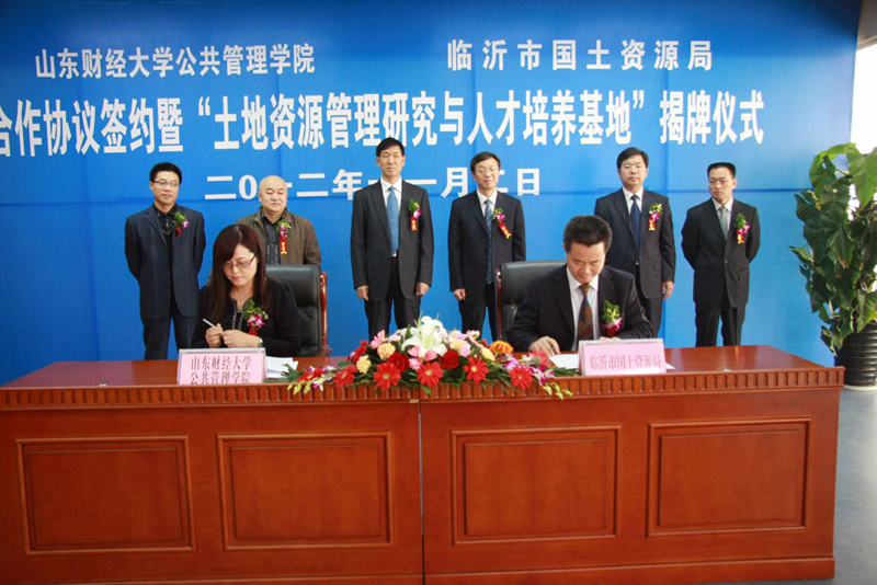 公共管理学院副院长李国锋、牟芳华、学院办公室及土地资源管理教研室的老师代表,临沂市国土资源局副局长范宝杰,党委委员朱化利及各科室负责人等一同出席签约和基地揭牌仪式。