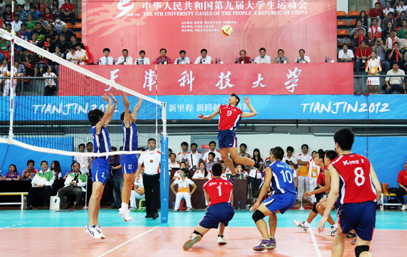 由教育部、国家体育总局、共青团中央主办的中华人民共和国第九届大学生运动会,于2012年9月8日至9月18日在天津市举行。排球决赛于2012年9月10日至9月17日,在天津科技大学和天津外国语大学体育馆同时进行。