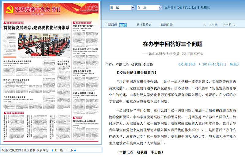 “习近平同志在报告中强调,‘加快一流大学和一流学科建设,实现高等教育内涵式发展’,这些重要论述令我深受鼓舞,信心倍增。”对报告中“优先发展教育事业”的论述,山东财经大学党委书记王邵军代表有着深入思考。他表示,在今后的办学实践中,要重点回答好以下三个问题。