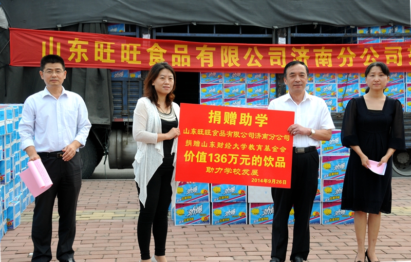 9月26日,山东旺旺食品有限公司济南分公司向学校捐赠产品仪式在圣井校区举行。党委副书记张东超、山东旺旺食品有限公司济南分公司总监陈红出席了捐赠仪式,学校有关部门负责人、旺旺食品有限公司有关部门负责人及教师、学生代表参加了仪式。捐赠仪式由校友工作办公室主任、教育基金会秘书长耿金波主持。