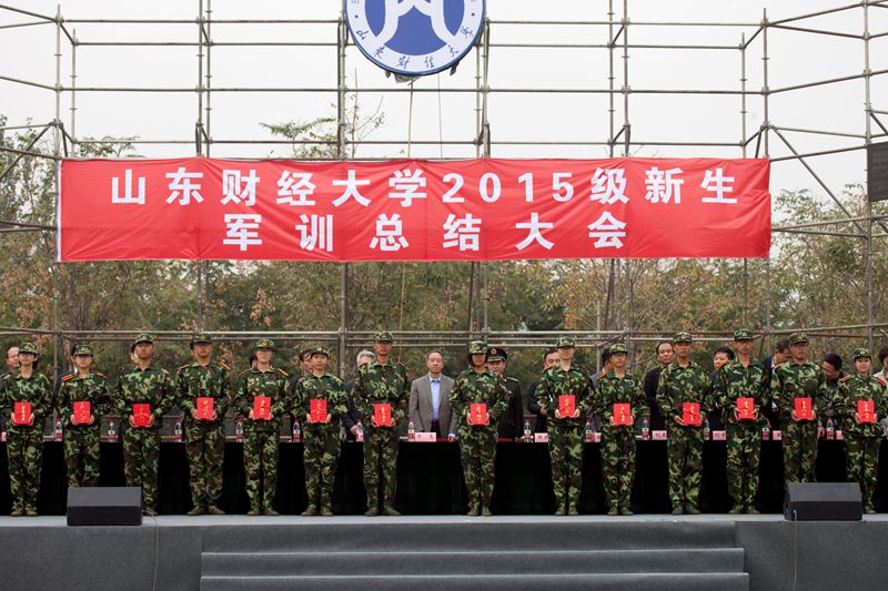 崔孝国代表承训部队讲话。新生代表王偌涵、高运东分别发言。学校各职能部门负责人,各学院党委书记、分管学生工作副书记、新生辅导员和全体2015级新生参加大会。经济学院周鹏辉、徐坤建等472名学生荣获“优秀军训学生” 荣誉称号;邓立新、赵鹏等28名教官荣获“优秀军训教官” 荣誉称号;王倩倩、高杨等10名同志荣获“2015年国防教育先进工作者”荣誉称号;圣井校区一营六连、明水校区一营一连等29个连队荣获“2015年国防教育先进连队”荣誉称号;金融学院、会计学院等11个学院荣获“2015年国防教育先进集体”荣誉称号;经济学院、国际教育学院等9个学院荣获“2015年国防教育优秀组织单位”荣誉称号。