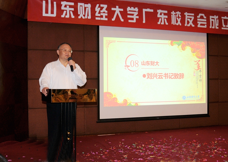 刘兴云在讲话中代表全校师生向广东校友会成立表示诚挚祝贺,向长期以来关心母校建设和发展的校友们表示衷心感谢,向为成立大会付出辛勤劳动的校友表示深切问候,向各位校友取得的成绩表示祝贺。他介绍了学校发展情况。他说,校友是学校的名片,是学校的未来,校友会是广大校友连接母校与校友、校友之间的平台。希望校友会发挥好服务的作用,为校友活动、广大校友的发展提供良好的服务;发挥好联系的作用,让校友之间、校友与母校之间的联系更加紧密;发挥好助推作用,成为校友互助共进的平台和快速发展的助推器。无论校友们走到哪里,身处何境,都不要忘记你们是山东财大人,山东财经大学永远是校友的精神家园,欢迎你们常回家看看。