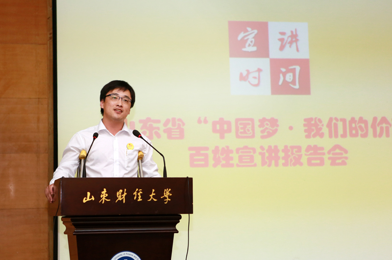 宣讲会上,百姓宣讲团成员,济南市育园学校教师孙屿萌、鱼台县鹤来香食品有限公司总经理李小刚、济南市殡仪馆入殓师辛沙沙、蓬莱市文化馆工作人员李慧莹、齐河县焕云团队励志讲师朱英超、济南市公交总公司K52路司机董丹等,分别作了题为《我骄傲 不只因为桃李芬芳》、《李小刚的“三农”实践》、《只为人生谢幕时的美丽》、《我有一件黑礼服》、《告诉世界我来过》、《十米车厢里的生死考验》的宣讲报告。六位宣讲员都是来自基层的普通劳动者,他们或无怨无悔的从事特殊教育,或满腔热情的投身“三农”实践;在面对人生困境时坚忍不拔、勇担责任;以柔弱之躯勇斗歹徒保护群众生命财产安全,这些感人至深的事迹和他们身上展现出的高尚品质不仅博得了师生们赞扬掌声和感动的泪水,更使大家受到思想的触动和心灵的洗礼。