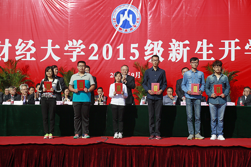 典礼开始,全体人员齐声高唱国歌。副校长聂培尧宣读《关于颁发2015级优秀新生入学奖学金的决定》,获得入学奖学金的同学上台领取奖金和证书。数学与数量经济学院王继强、管理科学与工程学院吴修国作为教师代表分别发言。校友代表、中国建设银行山东省分行副行长朱治昌致辞。在校生代表、保险学院金相安,新生代表、金融学院林久冉、会计学院宋建峰分别发言。典礼最后,全体新生作了庄严宣誓。