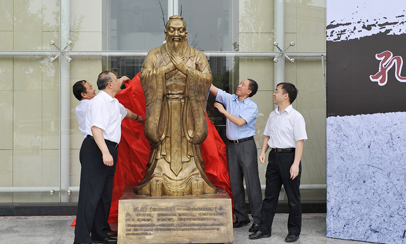 此尊孔子铜像由中国孔子基金会监制,高2.36米(人物净高1.96米),是国家领导人对外赠送孔子像的标准高度。