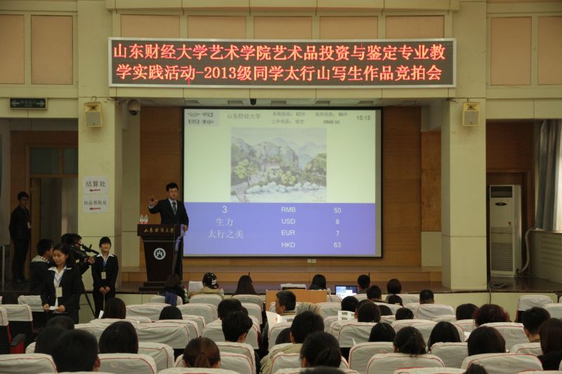 11月8日下午,艺术学院在燕山校区3号报告厅举办了太行山写生作品竞拍会。副校长胡文波、艺术学院师生和校内外各界喜欢书画的朋友参加了此次活动。整个竞拍过程严格按照商业模式进行,紧张有序、气氛活跃。由艺术学院主办,北京宏艺堂品牌管理有限公司协办的本次竞拍是一次大胆而生动的实践教学,得到了学校领导和有关部门的大力支持与协助。