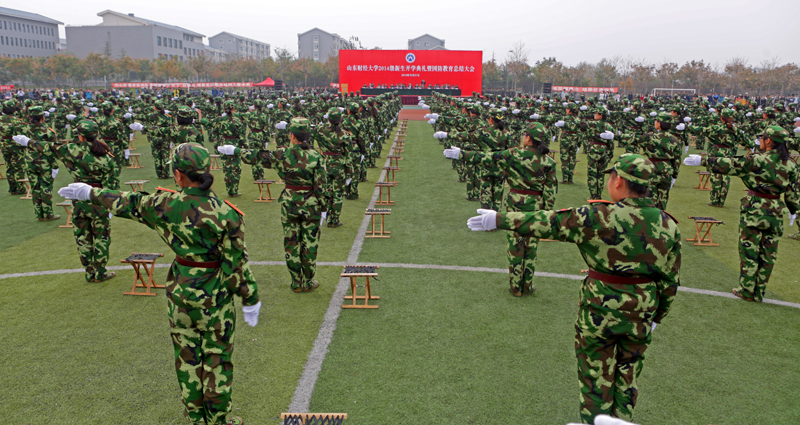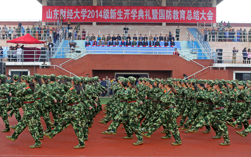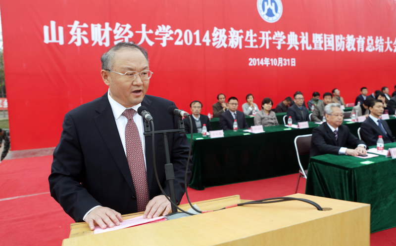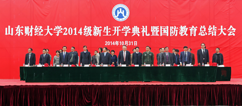 10月31日,山东财经大学2014级新生开学典礼暨国防教育总结大会在明水校区和圣井校区隆重举行。学校领导刘兴云、张东超、聂培尧、綦好东、李明勇、吴彬,承训部队中国人民解放军71939部队副旅长马如超上校,校友代表、省食品药品监督管理局局长马越男、润华药业公司总经理郝信东出席大会。副校长胡文波主持大会。