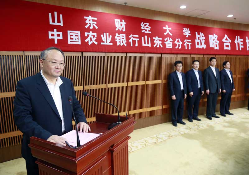 10月12日下午,中国农业银行山东省分行银河大厦5楼会议室装点得隆重热烈,“山东财经大学、中国农业银行山东省分行战略合作协议签约仪式”条幅高挂,喜洋洋的背景音乐衬托出欢快的气氛。双方的签约,标志着“多层次、宽领域、紧密型”的合作关系正在构建。