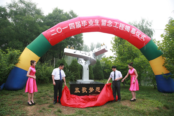 仪式上,东方学院分党委副书记宫淑瑰致辞。随后,綦好东和东方学院常务副院长、分党委副书记高立明共同为“放歌梦想”留念工程揭幕。2014届毕业生留念工程座落于东方学院金源桥东南侧,取名为“放歌梦想”。寓意为青春放歌,带着梦想起航,表明了东方学子经过四年寒窗苦读,学业有成,即将踏入社会,立志成才,报效国家。雕塑整体造型寓意为东方学院是在党和国家政策法规的指引下,为创办校风严谨 、机制灵活、管理规范、特色鲜明,省内外有一定影响力的示范性独立学院而奋斗的决心;也寓意为东方学院以本科教育为主体,创品牌;以继续教育和国际合作办学为两翼,增强市场竞争能力的 “一体两翼”发展战略。2014届毕业生留念工程的落成又为东方学院增添了一处具有特殊意义的人文景观,代表了2014届全体毕业生对母校、对老师的深情厚意、美好祝愿和庄重承诺,它将作为历史的见证,为母校永久珍藏。