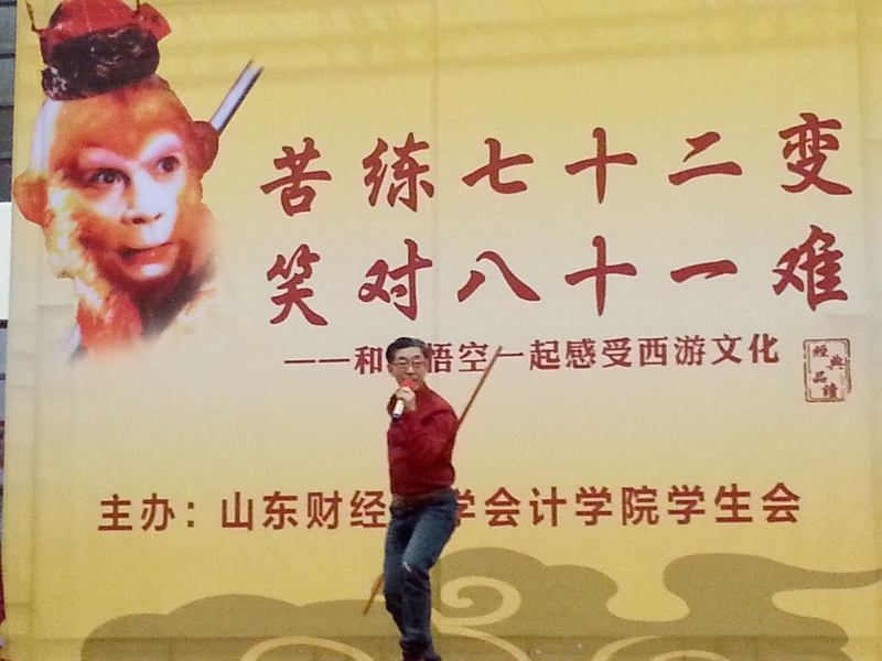 5月8日,应会计学院学生会邀请,著名表演艺术家“六小龄童”章金莱先生在明水校区体育馆为我校学生作题为“苦练七十二变,笑对八十一难”的报告。党委副书记牟思伦出席报告会,学生处、会计学院有关负责人及明水校区千余名师生到场聆听了报告。