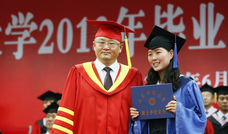 2013届毕业生学位授予仪式上,导师代表入场之后,接受了毕业生代表送上的鲜花。刘兴云与毕业研究生逐一握手表示祝贺,为他们颁发学位证书并合影留念。导师代表为本科毕业生逐一颁发学位证书。