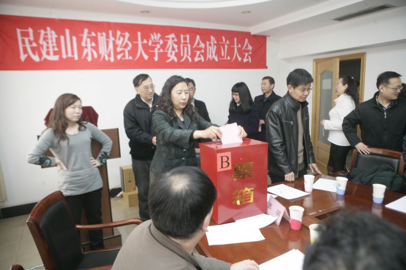 我校民建会员、省政协常委黄磊主持会议,民建原山东经济学院支部主委、省政协常委宋焱作工作报告;民建省委组织部副部长曾鹏宣读了“民建山东省委员会关于成立民建山东财经大学委员会的决定”,民建省委组织部范虎部长主持民建山东财经大学委员会以及燕山校区支部委员会、舜耕校区支社部委员会的选举程序。
