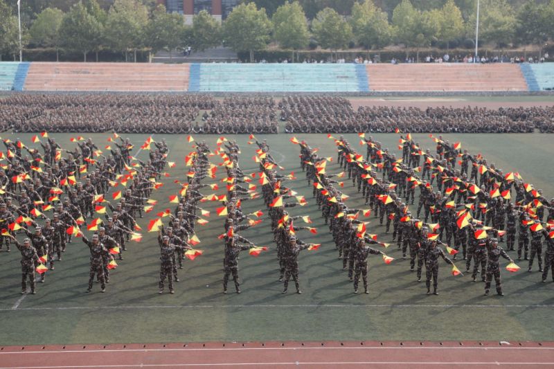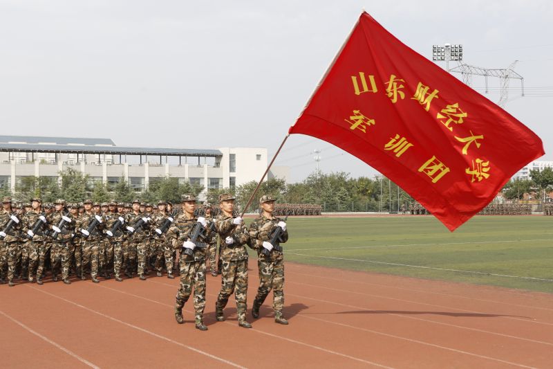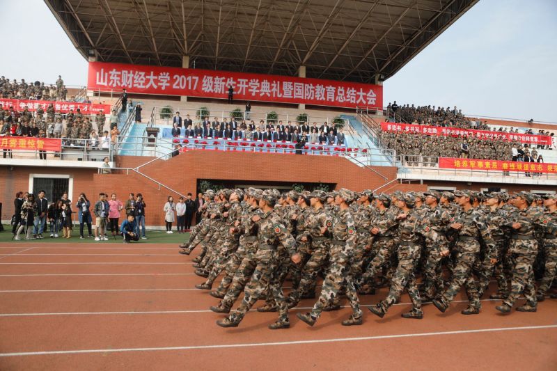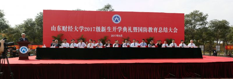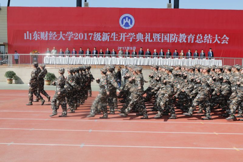 校党委书记王邵军宣布山东财经大学2017级新生开学典礼暨国防教育总结大会开始。在全体人员迎国旗,齐声高唱国歌、升国旗后,军训团进行了分列式及表演课目演练,海军手旗、擒敌拳、战术、木质警棍、捕俘刀、活字印刷、军体拳等不时博得阵阵掌声。