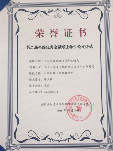 近日,在全国金融专业学位研究生教育工作会议上公布了第二届全国优秀金融硕士学位论文评选结果并举行了颁奖仪式。金融学院沈丽教授指导的2014届金融专业硕士唐立强的毕业论文《基于产品差异化的我国信用卡竞争研究》荣获“全国优秀金融硕士学位论文”奖项。