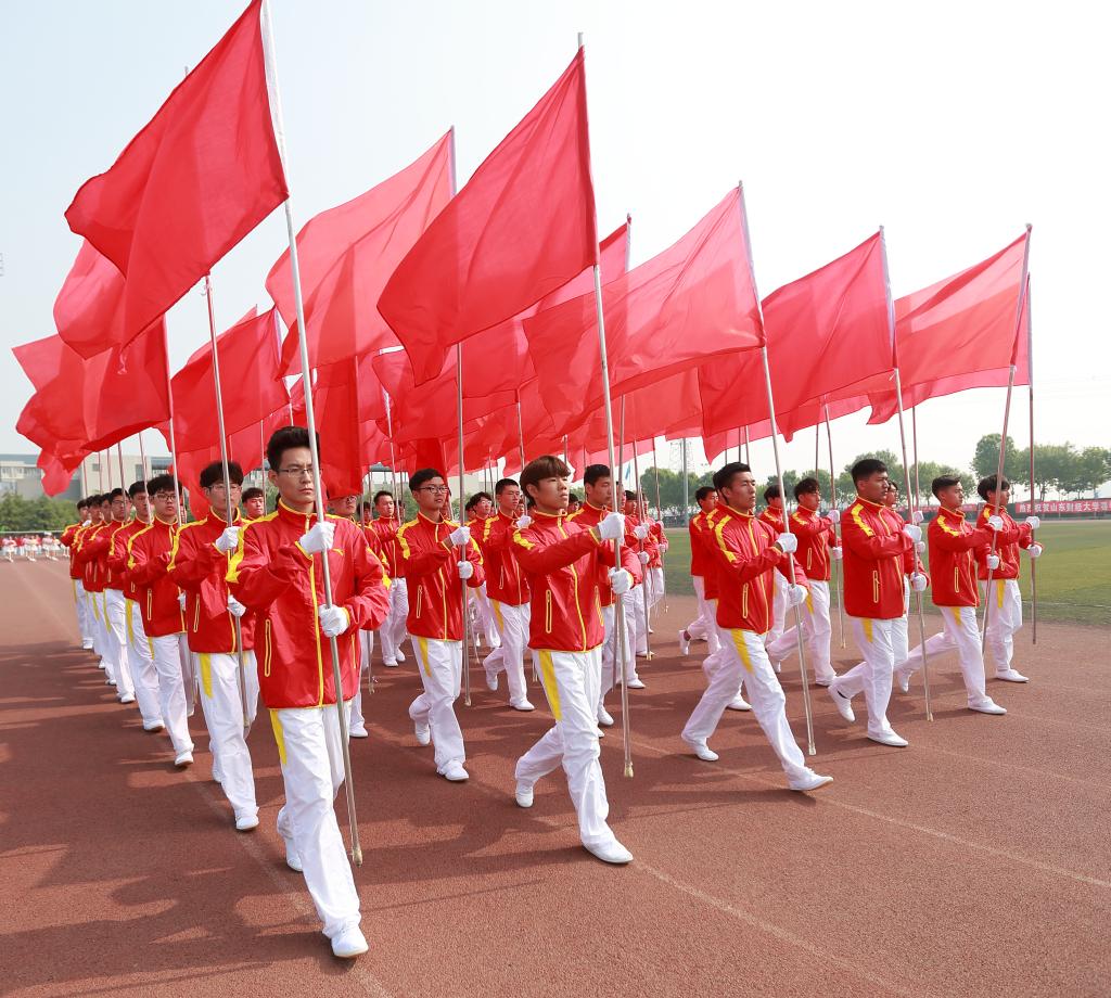 伴随着《运动员进行曲》的激扬旋律,六名国旗班学生护送国旗入场,红旗队、花束队、各学院学生方队迈着整齐的步伐,喊着响亮的口号,依次走过主席台前方。随后,举行了庄严的升国旗唱国歌仪式。