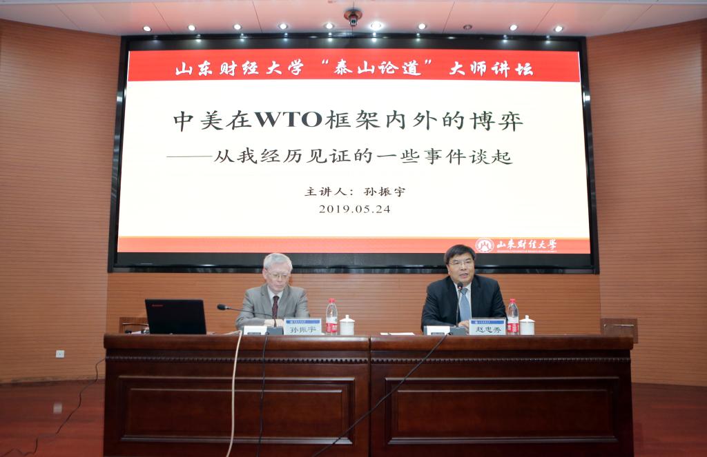 赵忠秀致辞,对孙振宇大使的到来致以热烈欢迎。他指出,今年是新中国成立70周年,正行进在中华民族伟大复兴的征程中,犹如攀登泰山正在途中。2001年中国加入世界贸易组织在中国发展征程中具有重大意义,孙振宇作为中国首任驻世贸组织大使,肩负重任,亲历历史,见证历程。希望我校师生通过这次难得的“泰山论道”大师讲坛,就中国的开放发展及多边贸易体制的演变与挑战求教于知名专家,提高我校师生的学术水平和科研素养。