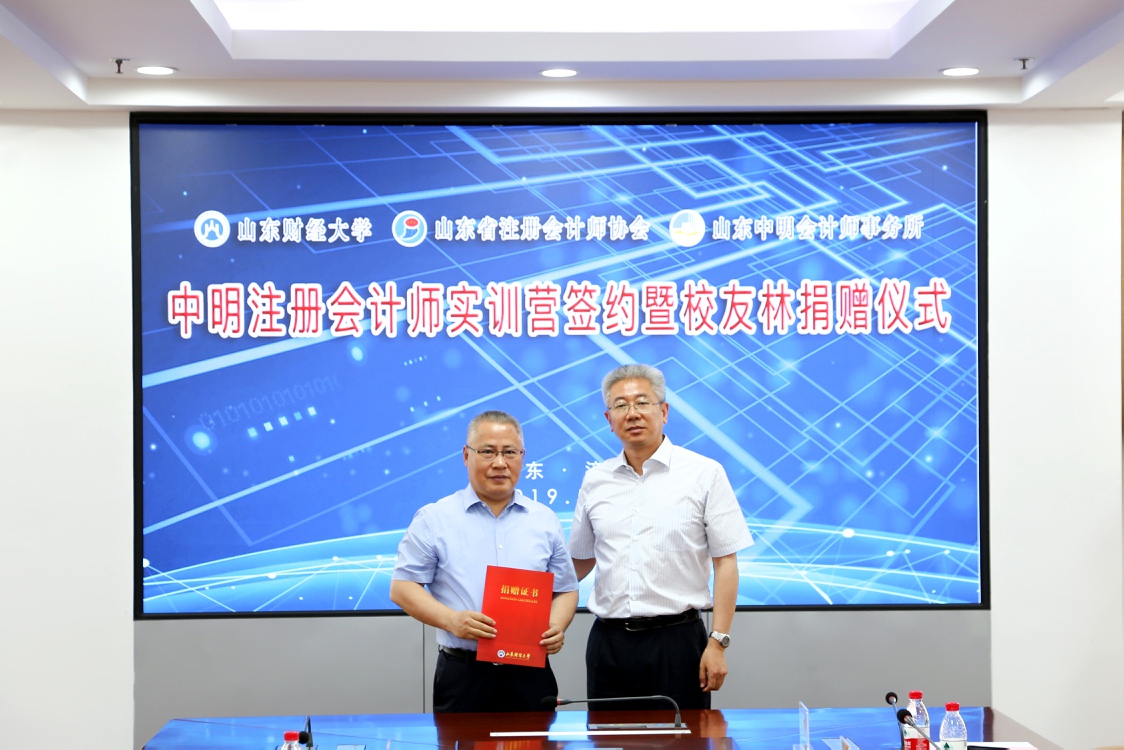5月24日下午,我校和山东省注册会计师协会、山东中明会计师事务所三方签约共建中明注册会计师方向实训营。副校长张新、山东省注册会计师协会会长韩群、副会长梁仕念,山东中明会计师事务所董事长巴树青出席活动。仪式由会计学院党委书记张涛主持。