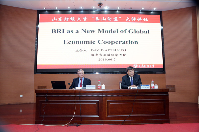 6月24日上午,阿普恰乌利先生在“泰山论道”大师讲坛为我校300余名师生作了题为BRI as a New Model of Global Economic Cooperation的主题演讲。赵忠秀出席并为讲坛致辞。他表示十分荣幸能邀请阿普恰乌利先生来到山东财经大学的大师讲坛,大使先生将从一个全新的角度探讨中国的“一带一路”倡议,希望同学们能够用全球化的视野来看待中国的发展战略并得出自己正确的理解。