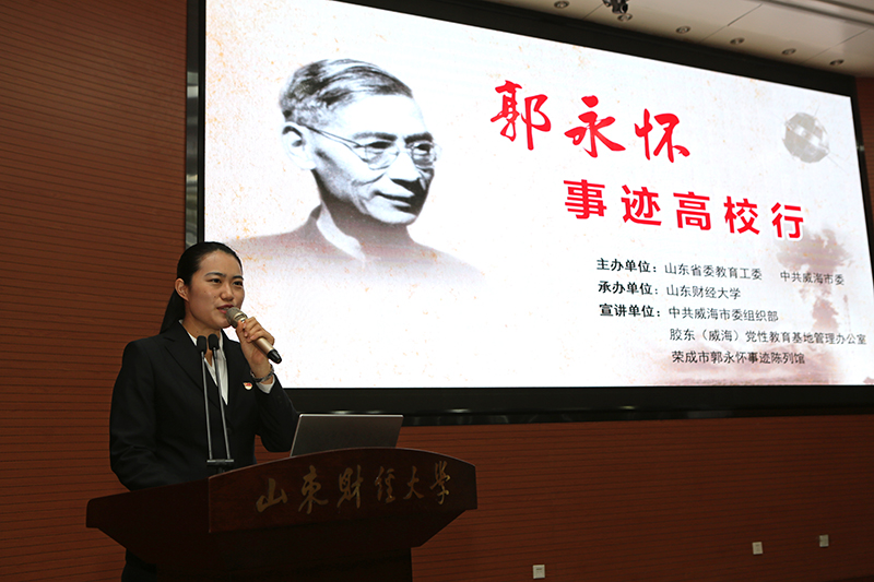 车滨在主持时说,省委书记刘家义在主持山东干部讲堂郭永怀事迹报告会时曾指出,郭永怀是一面镜子,我们每个人都应对照这面镜子,检视自己的灵魂、初心和使命。郭永怀同志的事迹感人至深,精神催人奋进,我们上了一场特殊的主题党课。广大党员干部、师生员工要以此次报告会为契机,深入学习郭永怀同志的先进事迹和崇高精神,学习他无私奉献、以身许国的爱国精神,学习他勇攀高峰、敢为人先的创新精神,学习他集智攻关、团结协作的协同精神,学习他自力更生、苦干实干的奋斗精神,学习他一心为国、淡泊名利的奉献精神,扎实推进“不忘初心、牢记使命”主题教育,持续推动学习贯彻习近平新时代中国特色社会主义思想往深里走、往心里走、往实里走,明确努力方向,着力破解发展难题,为全面建成全国一流财经特色名校,为实现伟大的中国梦而努力奋斗。