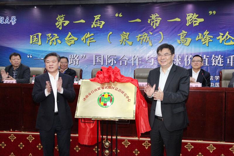 会上,济南市自由贸易试验区法治研究中心挂牌成立,秦传滨和赵忠秀共同为中心揭牌。