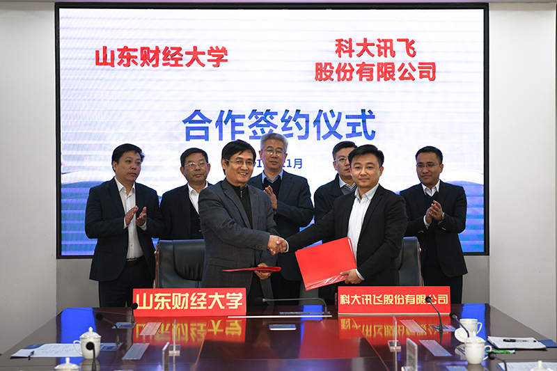 11月18日上午,山东财经大学与科大讯飞股份有限公司战略合作协议签约仪式在燕山校区办公楼七楼会议室举行,副校长张新出席并讲话。科大讯飞销委会副总裁黄飞云、智慧城市高教业务线总监张磊、智慧城市行业总监姚家成、大数据与人工智能教研总工年夫坤、高教业务山东市场总监井辉、山东大区市场经理刘青以及学校合作发展处、计算机科学与技术学院有关负责人出席签字仪式。