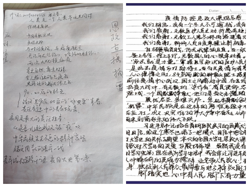 公共管理学院的2019级学生张文荣、尹宏桥、任珂是这次防疫战的志愿者。对这次思政课,他们有着强烈的共鸣。“ ‘士不可以不弘毅,任重而道远’,做了志愿者,真正让我们感受到我也是中国的一份子的集体感和天下兴亡匹夫有责的责任感。只有把个人奋斗融入到国家发展中来,做有责任、有担当的时代新人,我们才能在奋斗担当中谱写青春篇章。”