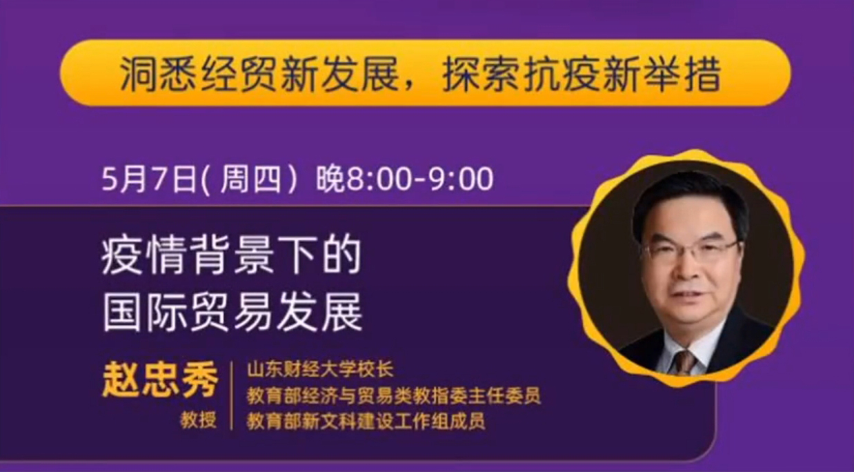 在全国抗击新冠病毒的特殊时期,为助力高校教师、学生及广大群众线上学习,促进经济与贸易类专业教育发展,教育部高等学校经济与贸易类专业教学指导委员会联合清华大学出版社,推出疫情背景下的经济与贸易系列公益直播——“经贸教指委抗疫公益大讲堂”。5月7日,第一季揭幕直播由教育部经贸类专业教指委主任委员、教育部新文科建设工作组成员、我校校长赵忠秀主讲。