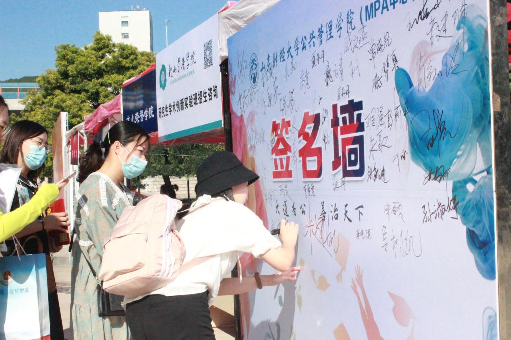 各学院纷纷推出各具特色的迎新举措。经济学院设置了专门的“互动答疑区”;财政税务学院的学长学姐为新生们写下寄语,将美好的祝福送给新生;金融学院的“梦想手册”承载了新生对即将到来的研究生生活的向往;保险学院设立了迎新“朋友圈”合影墙;国际经贸学院为新生入学精心准备了温馨小贴士,帮助新同学全面了解新环境;管理科学与工程学院设置专门的负责人,一对一引导新生完成报到工作;工商管理学院制作了印有全体新生名字的心形展板;会计学院为各个新生班级组建了微信群,帮助同学们尽快融入班集体;公共管理学院设置签名墙,留下了新生入校的第一笔;计算机科学与技术学院设立了新生合影留念打卡地,打卡地配有学院院宠“山财大计科带你乘风破浪”;法学院为新生们准备了特色签名活动,新生可以在大展板上写下自己的名字和期许;外国语学院在现场设置迎新墙,让同学们写下对未来生活的憧憬与期待;数学与数量经济学院制作了时光胶囊,留下新生们初入学校时的美好心愿;文学与新闻传播学院的迎新志愿者穿戴汉服迎接新生,生动体现了文学院的特色;马克思主义学院为新生设立“与财大初次相遇”合影纪念相框,留下了新生与校园的第一次同框;公共外语教学部组织“时光信件——写给未来的自己”活动,将新生们的期许寄到未来。