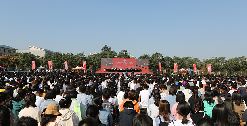 金秋时节丹桂飘香,圣井校园秋高气爽。田径场上8条红底白字的竖幅标语,“生于非典,无磨难不成人”“考于新冠,无奋斗不成才”“用行动谱写绚丽青春华章”“用奋斗创造无限美好未来”“财大新起点,立鸿鹄之志”“脚下有力量,肩上担使命,行则将至”“人生新舞台,养浩然正气”“心中有信仰,眼中有家国,未来可期”,悬挂在主席台南北两侧,校歌《梦想花开》的悠扬旋律飘荡在田径场上空,现场气氛欢快热烈。