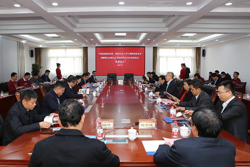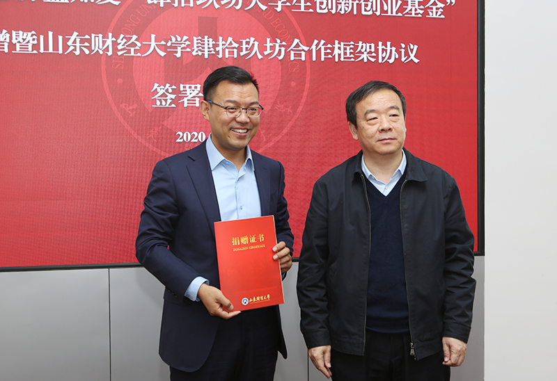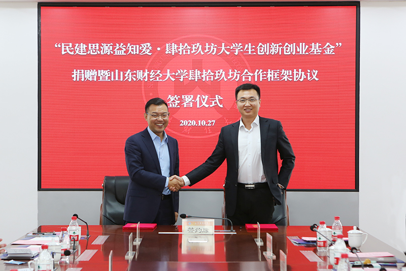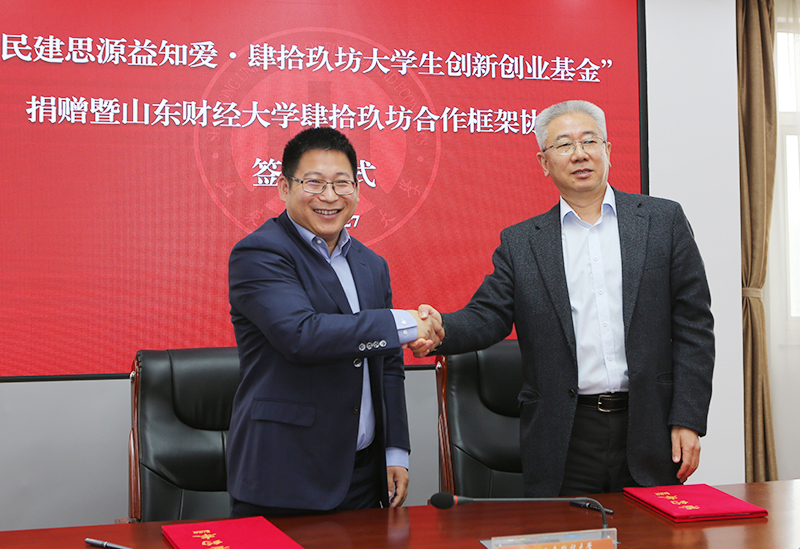 10月27日上午,“民建思源益知爱·肆拾玖坊大学生创新创业基金”捐赠暨山东财经大学与肆拾玖坊校企合作协议签署仪式在我校燕山校区举行。山东省政协副主席、民建山东省委主委郭爱玲、学校党委书记王邵军和肆拾玖坊创始人张传宗等领导嘉宾出席活动。副校长张新主持活动。