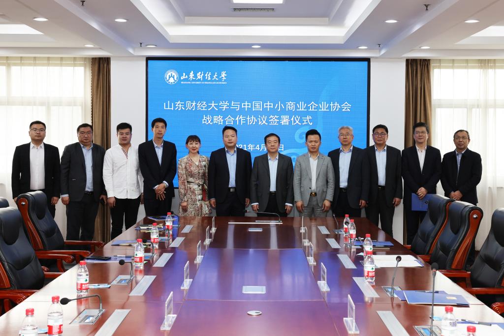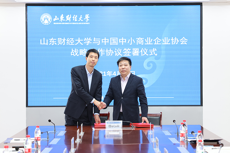 4月27日,山东财经大学与中国中小商业企业协会战略合作协议签约仪式在燕山校区举行。山东财经大学党委书记王邵军、副校长张新,中国中小商业企业协会党委书记、常务副会长任兴磊,副会长王治伟、刁志洁等出席签约仪式并进行了座谈。