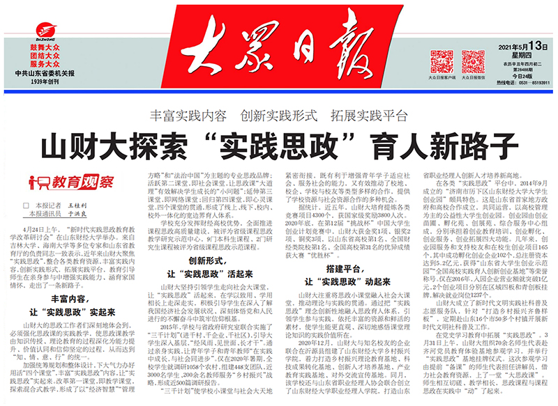 4月24日上午,“新时代实践思政教育教学改革研讨会”在山东财经大学举办。来自吉林大学、海南大学等多位专家和山东省教育厅的负责同志一致表示,近年来山财大聚焦“实践思政”,整合各类教育资源,丰富实践内容,创新实践形式,拓展实践平台,教育引导师生在亲身参与中增强实践能力、涵育家国情怀,走出了一条新路子。