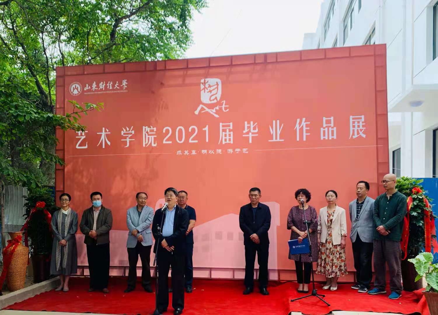 张书学在致辞中代表学校向陈列馆的建设者和为筹备作品展付出辛勤劳动的艺术学院师生表示感谢。他谈到,2021年的毕业季是非常不平凡的,我们即将迎来中国共产党100周年华诞,今年还是我国十四五规划的开局之年,又是两个一百年奋斗目标的交汇之年,国家的迅猛发展和日益强大给青年人的事业成长提供了广阔舞台,希望生逢盛世的同学们倍加珍惜,不断砥砺奋进,谱写精彩的人生篇章。近年来,艺术学院坚持“艺术+财经”的特色发展模式,坚持“求其真、明以德、游于艺”的教育理念,不断提高教育教学质量,赢得了很高的社会声誉,招生分数和生源质量不断提升。实践证明,除了课堂上的理论传授之外,实景写生、作品拍卖、艺术调研、专业实习、作品展示、课程国际化等实践类课程对艺术类专业人才的培养是非常重要的。他指出,随着新建场馆的逐步投入使用,艺术学院的办学条件将大大改善,希望艺术学院科学统筹,充分发挥好新院址在教学、会展、陈列、实践、交流等多方面的功能,不断提高育人质量,为学校争创双一流财经特色名校做出积极贡献。