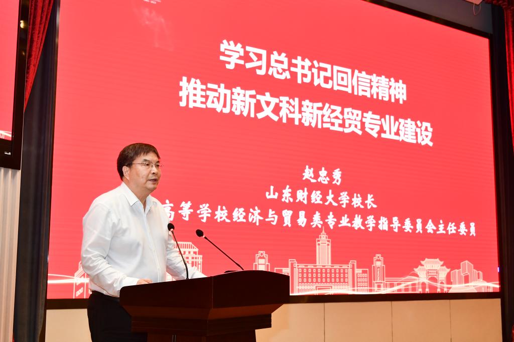 赵忠秀在演讲中指出,习近平总书记给《文史哲》编辑部重要回信精神和习近平总书记2016年在哲学社会科学工作座谈会上的讲话、2021年在清华大学考察时的讲话精神是一脉相承的,为做好新时代哲学社会科学工作和高等教育发展提供了根本遵循和行动指南。赵忠秀强调,新经贸人才的培养,要牢牢把握新时代、新理念、新格局,着力培养面向数字贸易发展和全球经济治理的国际化人才,并从人工智能(AI)、区块链(Blockchain)、云(Cloud)、数字化(Digital)、情感(Emotion)、面向未来(Future)、全球视野(Global)等七个维度,阐述了推进新经贸专业建设的工作思路。赵忠秀指出,近年来,山东财经大学在新文科建设中进行了创新性探索和实践。一是强化拔尖人才培养,主动对标“强基计划”,成立龙山荣誉学院,培养经管基础学科拔尖人才;二是强化新专业建设,整合校内外资源,推动专业交叉融合,着力建设大数据科学、金融科技、智能会计等新文科专业;三是强化新平台建设,成立中日韩研究院、中国国际低碳学院、乡村振兴学院、新旧动能转换研究院等机构;四是强化新学科建设,探索建设国际发展合作本科和研究生专业,培养具有国际视野、战略思维、国际谈判和沟通能力的复合型人才。
