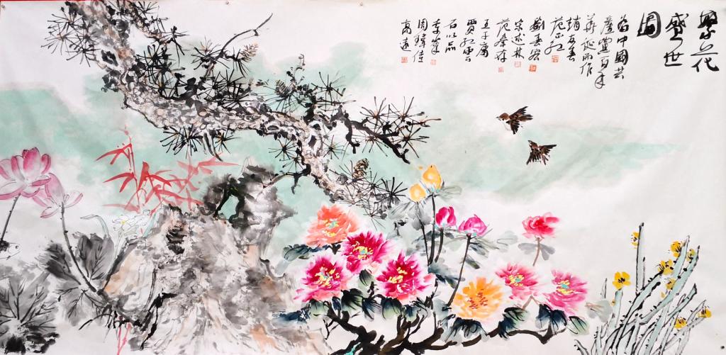 笔会历时三个多小时,一幅长240cm、宽120cm八尺整张的《繁花盛世图》立时呈现在大家眼前,现场响起热烈掌声。范正红为画作题名并落款,创作者依次钤印。赵友春与各位创作者手持画作合影留念。