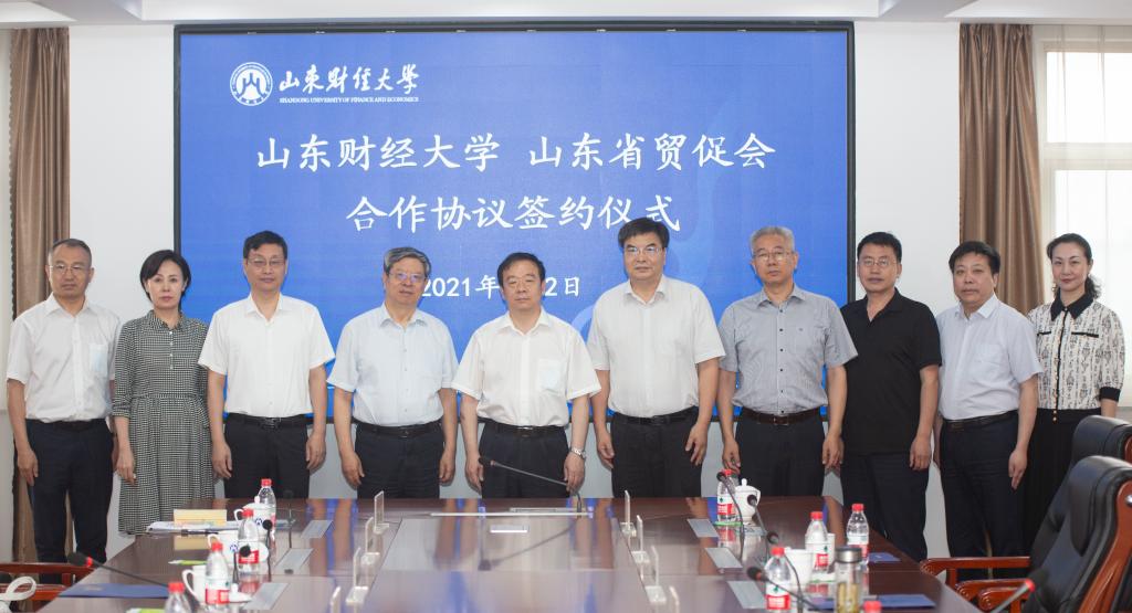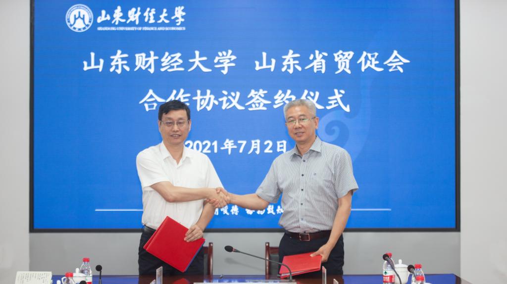 7月2日,山东财经大学与中国国际贸易促进委员会山东省委员会(简称:山东省贸促会)合作协议签约仪式在燕山校区举行。山东省贸促会党组书记、会长于风贵、副会长贺忠军、秘书长陈彤,学校党委书记王邵军、校长赵忠秀、副校长张新出席签约仪式并进行座谈。王邵军、于风贵致辞,张新、贺忠军分别代表双方签约,赵忠秀主持签约仪式。