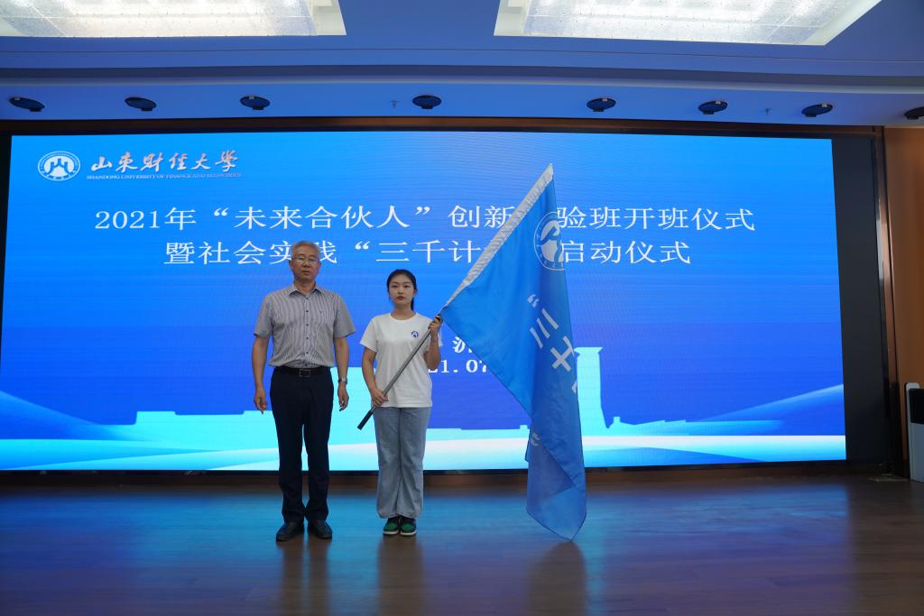 张新为“三千计划”重大项目团队授旗。“未来合伙人”创新实验班学生代表、管理科学与工程学院学生会主席王帅发言。