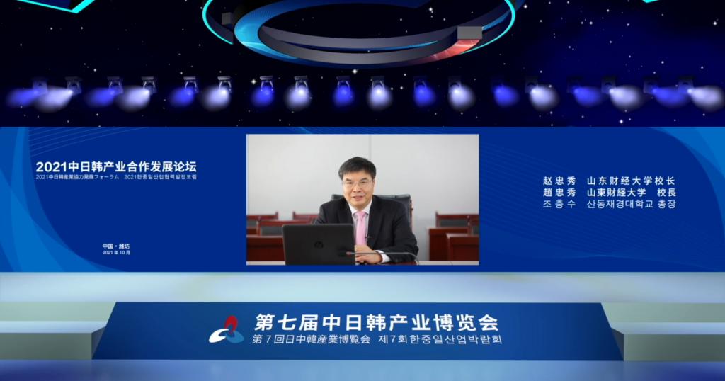 10月26日,第七届中日韩产业博览会开幕式暨2021中日韩产业合作发展论坛在潍坊通过视频形式举行。联合国前秘书长、博鳌亚洲论坛理事长潘基文,韩国前总理李海瓒,山东省副省长汲斌昌,中国贸促会党组成员、副会长卢鹏起,潍坊市委副书记、市长刘运在开幕式上致辞;中国驻日本大使孔铉佑、中国驻韩国大使邢海明等参加论坛并发言。我校校长、中日韩研究院院长赵忠秀应邀出席并作了题为“构建多维协同引资体系,提高日韩外资利用质量”的主旨演讲。