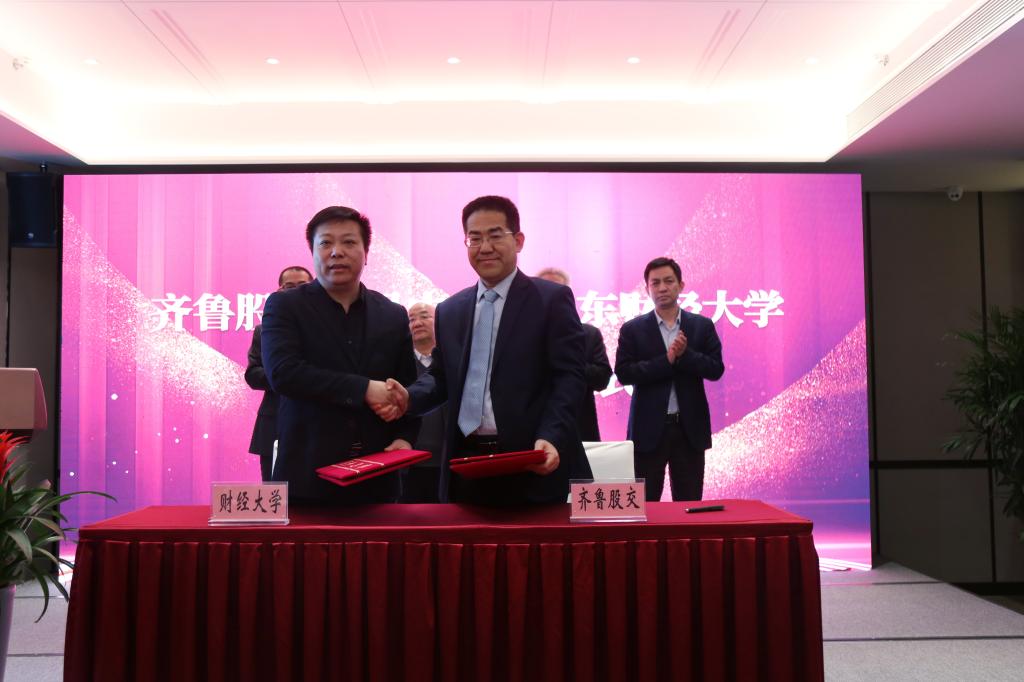 11月11日,山东财经大学与齐鲁股权交易中心合作协议签署暨山东财经大学产教研融合研究生联合培养示范基地、大学生社会实践基地揭牌仪式举行。中泰证券党委常委、党委副书记吕祥友,山东省地方金融监督管理局监管四处处长刘博、齐鲁股权交易中心党委书记、董事长王胜进,齐鲁股权交易中心总裁李学锋和我校副校长张新出席签约仪式并进行座谈。