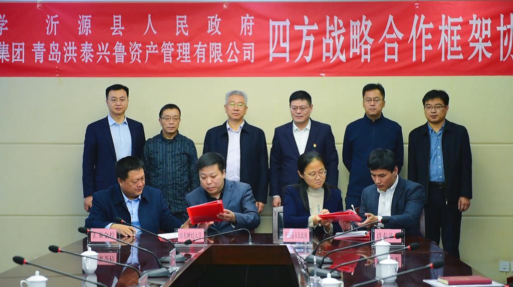 11月25日,山东财经大学、沂源县人民政府、深圳东方汇泉金融控股集团、青岛洪泰兴鲁资产管理有限公司共建乡村振兴学院战略合作协议签约仪式在沂源县举行。副校长张新,沂源县委副书记、县长张涛,副县长张莹莹,深圳东方汇泉金融控股集团董事局主席、乡村振兴学院院长董方军,青岛洪泰兴鲁资产管理有限公司代表刘奇等出席签约仪式。这是我校在2020年12月校企合作成立乡村振兴学院基础上进一步深化推进校政校企四方合作共建学院的重要举措。