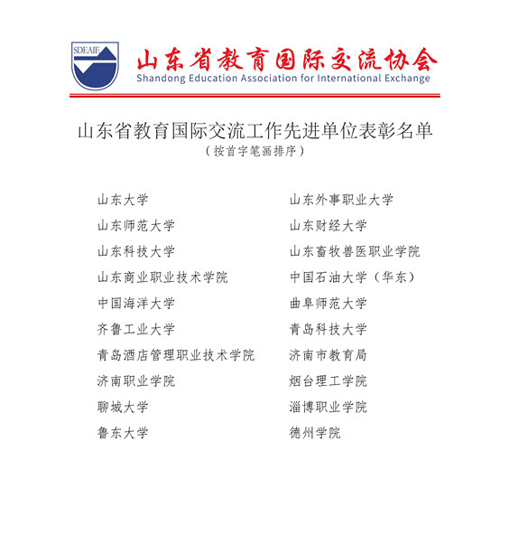 此次评选表彰活动是在山东省教育厅的指导下,由山东省教育国际交流协会组织开展,旨在表彰服务国家总体外交战略、服务全省经济社会文化发展的先进单位和先进个人。我校和山东大学等20个单位荣获“2021年度山东省教育国际交流工作先进单位”。