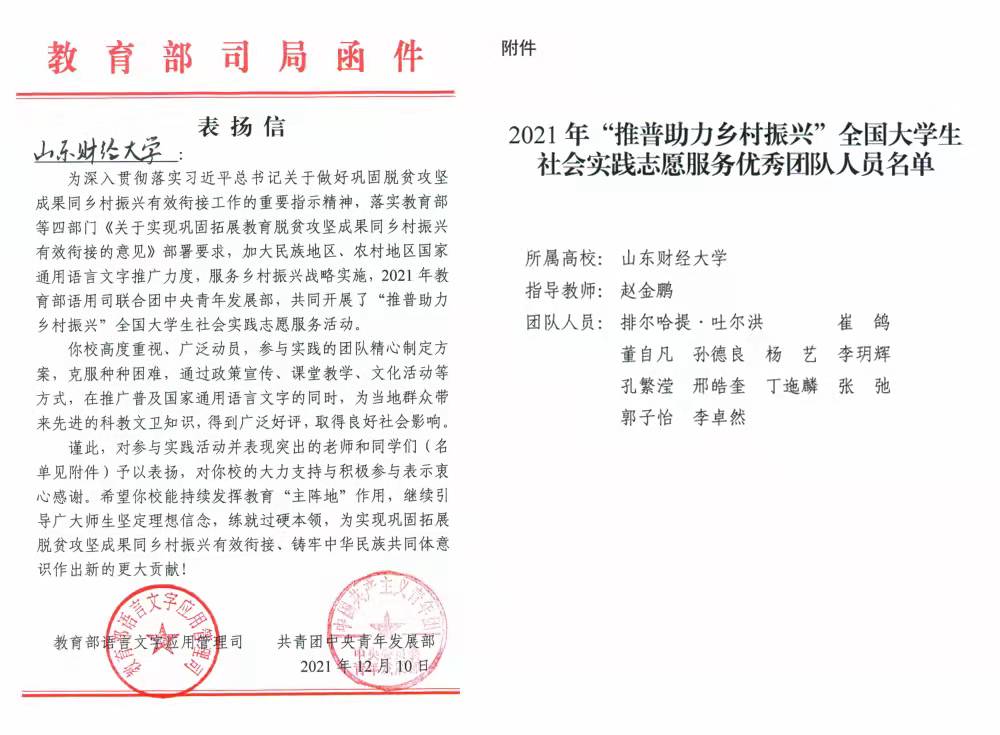 近日,教育部语言文字应用管理司和共青团中央青年发展部共同向学校发来表扬信,对我校社会实践“三千计划”“一言一行”团队提出表扬。这是学校连续两年收到教育部和团中央的表扬信。