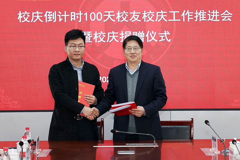 王邵军在讲话中向一直以来关心支持学校教育事业发展的广大校友、各界朋友表示衷心感谢!向捐赠嘉宾慷慨捐赠表示崇高敬意!向所有为校庆筹备工作而付出智慧和汗水的同志们表示衷心感谢!他指出,在校庆倒计时100天之际,我校教授、年轻校友,还有社会企业向学校校庆捐赠,让我们特别感动,也很受鼓舞。范正红教授艺术作品捐赠充分体现了他来校从教25年来对学校热爱之情深厚绵长,将有效助力我校文化艺术学科和专业建设;中铁建工集团山东公司捐资助力学校发展充分体现了企业的社会责任担当;李庆新校友向广大校友发起学校燕山校区文体馆捐建倡议并进行捐资,李欣、贾需校友为校庆捐资等,都充分体现了财大校友的拼搏精神和感恩情怀。