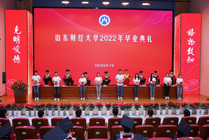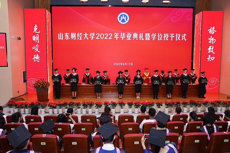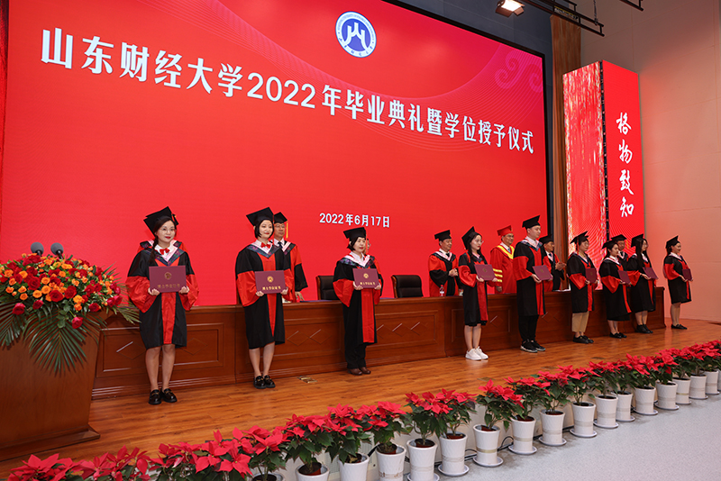 在全体起立奏唱国歌之后,副校长陶虎宣读了2022届普通本科学生毕业的决定,今年共有6995名应届本科学生完成学业,顺利毕业;546名学生获准颁发第二专业辅修证书;13名应届本科国际学生毕业,颁发本科毕业证书。副校长陈晓兰宣读了博士、硕士研究生毕业的决定。今年共有1296位研究生毕业,其中全日制博士研究生毕业生共26人、学术学位硕士研究生毕业生共380人、全日制专业学位硕士研究生毕业生共598人(含来华留学生6人)、非全日制专业学位硕士研究生毕业生共292人。副校长张培国宣读了关于表彰2022届优秀毕业生的决定,学校决定对刘书彤等500名“山东省优秀毕业生”、徐金等1011名“山东财经大学优秀毕业生”予以表彰。在喜悦欢快的乐曲中,兴高采烈的毕业生代表、优秀毕业生代表依次上台领取毕业证书及荣誉证书。