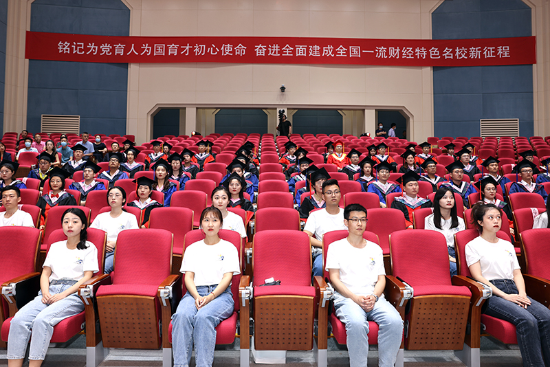 典礼现场,“克明峻德 格物致知”校训高悬主席台两侧,两侧墙壁上投射的校标变换着不同颜色,熠熠生辉。“铭记为党育人为国育才初心使命,奋进全面建成全国一流财经特色名校新征程”的横幅标语高悬在会场后方。“传薪七十载,筑梦新时代”,循环播放的70年校庆专题片《光荣与梦想》吸引了师生关注的目光。